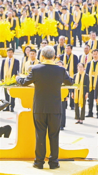 凈手上香。郝龍斌,全國人大代表、中國和平統一促進會香港總會常務副會長凌友詩,英國荷柏穎中藥公司總裁、第一位擔任英國市政廳閣員高職的華裔官員王臺生,泰國中華總商會主席林楚欽,緬甸中華總商會榮譽會長楊釧玉,華為集團高級副總裁楊瑞凱,深圳國際控股有限公司董事會主席李海濤,優必選科技股份有限公司董事會主席、執行董事兼行政總裁周劍,全國人大代表、全國勞模、好想你健康食品股份有限公司董事長石聚彬走到臺前,凈手上香。
